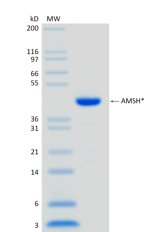 2 μg AMSH* run on 4-12% SDS-PAGE gel under reducing conditions, then visualized with Colloidal Coomassie Blue Stain.