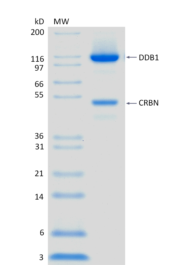 2 μg CRBN/DDB1 run on 4-12% SDS-PAGE gel under reducing conditions, then visualized with Colloidal Coomassie Blue Stain.For Research Use Only (RUO)
