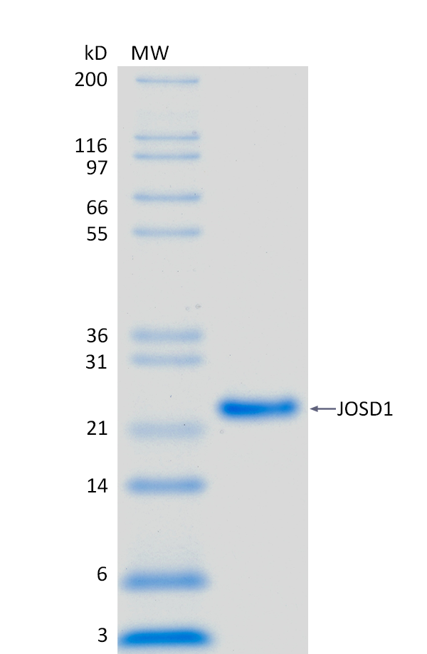 2 μg JOSD1 run on 4-12% SDS-PAGE gel under reducing conditions, then visualized with Colloidal Coomassie Blue Stain.