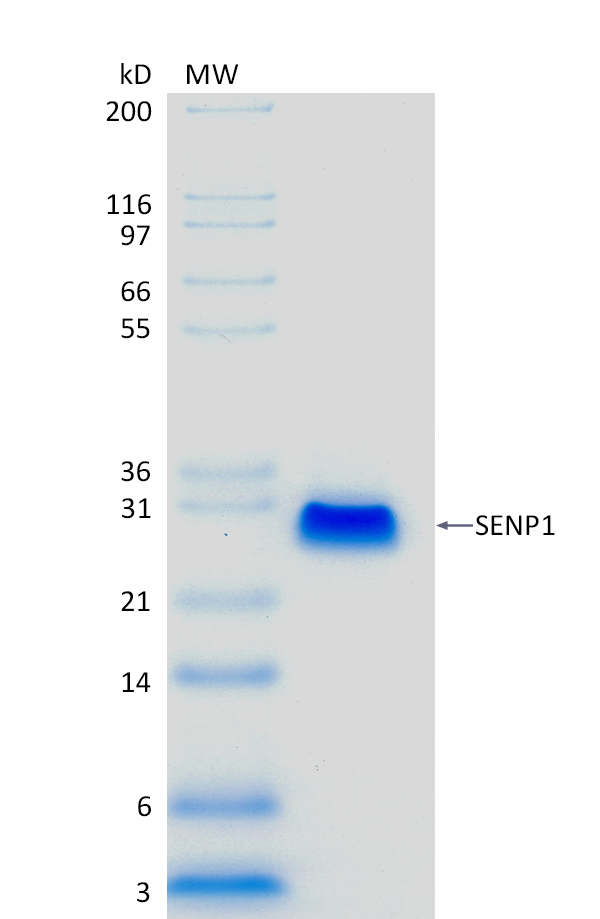 Background: SENP1 (sentrin/SUMO-specific protease 1) is a cysteine protease that reverses SUMOylation by processing SUMO precursors and deconjugating SUMO from target proteins. Structurally, it has an N-terminal regulatory region and a conserved C-terminal catalytic domain. By removing SUMO modifications, SENP1 modulates the activity, stability, and localization of transcription factors, signaling proteins, and DNA-repair factors, thereby influencing cell-cycle progression, apoptosis, and stress responses. SENP1 is upregulated by hypoxia and can enhance hypoxic signaling (for example, via HIF‑1α), and its dysregulation is linked to tumorigenesis and metastasis. In vitro, SENP1 is useful in removing SUMO fusion tags from recombinant proteins, or for de-SUMOylating proteins in lysates.