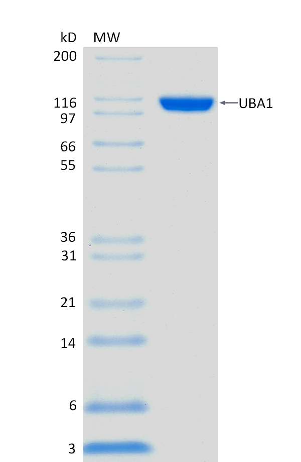 Verified Applications: Recombinant Ubiquitin Activating Enzyme 1 activates ubiquitin for subsequent transfer to a Ubiquitin Conjugating Enzyme (E2) in in vitro reactions. This initial event in the ubiquitin-proteasome cascade requires Mg-ATP and ubiquitin. Appropriate enzyme concentrations are specific to the application.