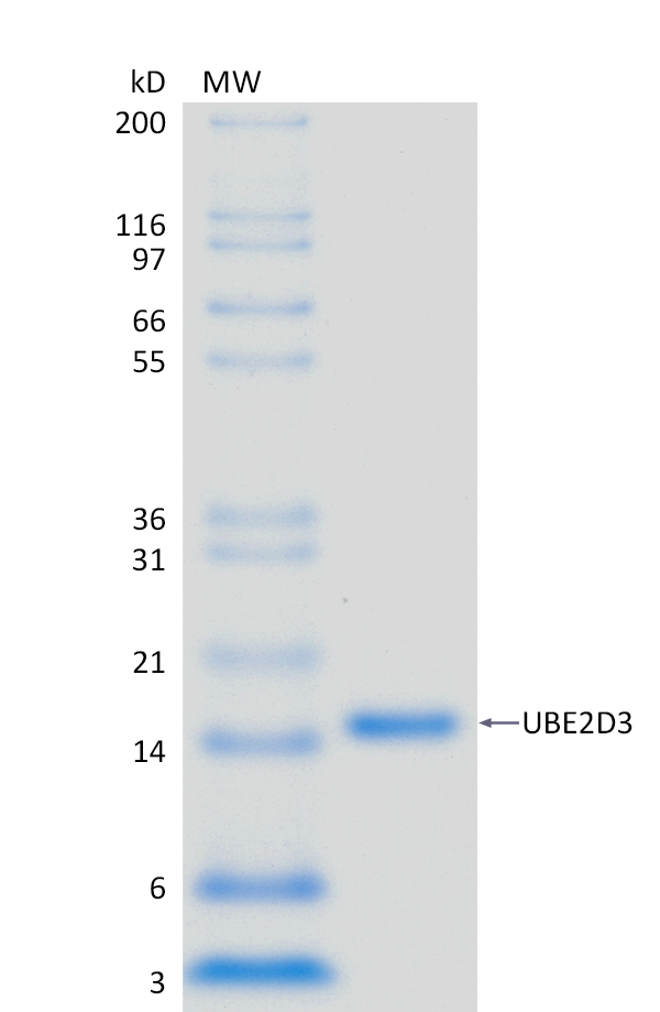 Background: Ubiquitin-Conjugating Enzyme E2 D3 (UBE2D3) is an E2 ubiquitin-conjugating enzyme that facilitates the transfer of ubiquitin from E1 activating enzymes to substrate proteins. This 147 amino acid protein is almost entirely UBC domain: an N-terminal α-helix for E3 docking, a four-stranded β-sheet, three α-helices and flexible catalytic loops. UBE2D3 forms thioester-linked UBE2D3-ubiquitin conjugates that cooperate with myriad E3s, including BRCA1/BARD1 in DNA repair, CHIP in chaperone quality control, and MDM2 or PIRH2 in p53 turnover.
