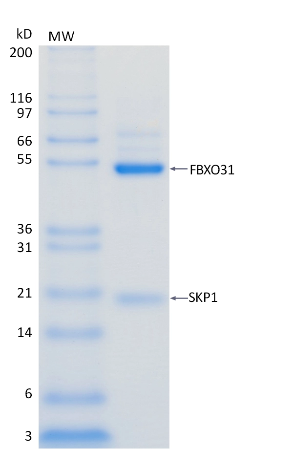 2 μg FBXO31 / SKP1 run on 4-12% SDS-PAGE gel under reducing conditions, then visualized with Colloidal Coomassie Blue Stain.For Research Use Only (RUO)