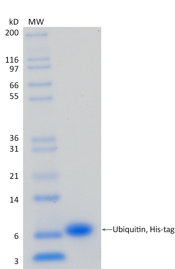 Verified Applications: Recombinant His-tagged ubiquitin is activated for use in vitro by Recombinant Ubiquitin Activating Enzyme 1 (UBA1). This initial event in the ubiquitin-proteasome cascade requires Mg-ATP and ubiquitin. Appropriate protein concentrations are specific to the application.