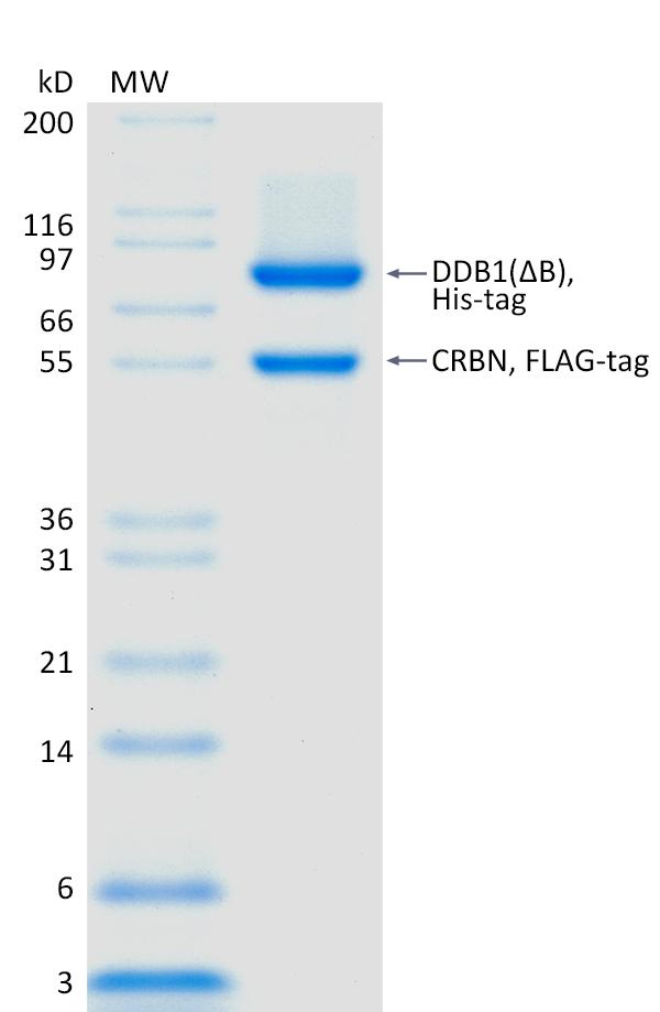2 μg CRBN/DDB1(ΔB) run on 4-12% SDS-PAGE gel under reducing conditions, then visualized with Colloidal Coomassie Blue Stain.For Research Use Only (RUO)