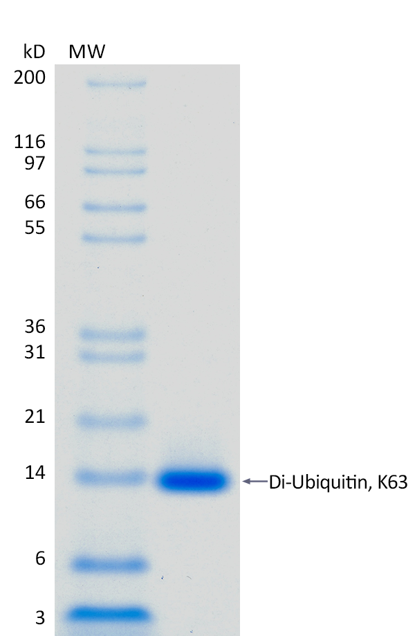 2 μg K63-linked Di-Ubiquitin run on 4-12% SDS-PAGE gel under reducing conditions, then visualized with Colloidal Coomassie Blue Stain.For Research Use Only (RUO)
