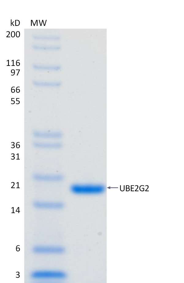 2 μg UBE2G2 run on 4-12% SDS-PAGE gel under reducing conditions, then visualized with Colloidal Coomassie Blue Stain.For Research Use Only (RUO)