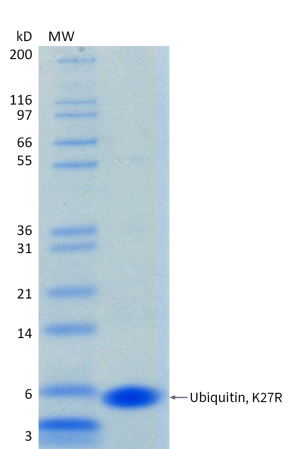 This recombinant ubiquitin protein contains a K27R mutation.