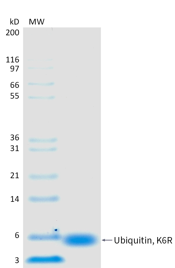 This recombinant ubiquitin protein contains a K6R mutation.